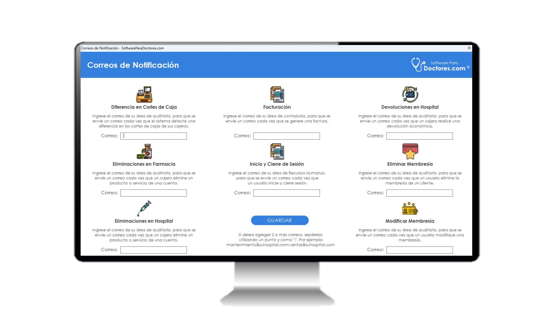 Inicio de Sesión, Cierre de Sesión, Diferencias en Cortes de Caja, Facturación y muchos temas más podrán configurarse para su módulo de Correos de Notificación para avisarle oportunamente sobre anomalías o malas prácticas realizadas dentro de su Hospital.